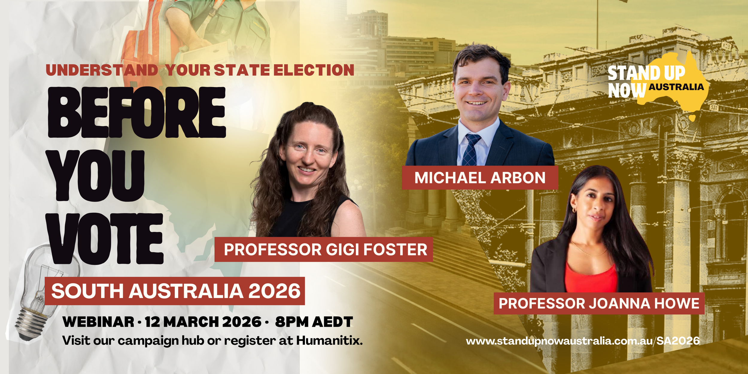 Hosted by Stand Up Now Australia as part of our SA Election 2026 public information series, this discussion brings together three voices from economics, law, and public policy to explore how current settings affect South Australians