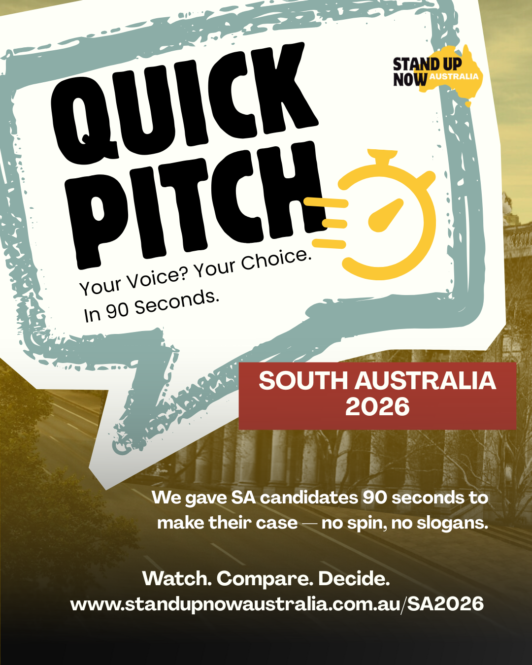 Stand Up Now Australia is inviting declared South Australian state election candidates to submit a ninety second video outlining their priorities and approach.